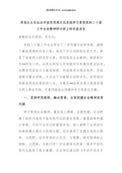【七哥公文】2024年:网信办主任在全市宣传思想文化系统学习贯彻党的二十届三中全会精神研讨班上的交流发言+更多免费公文+VX:QiGeGongWen2024