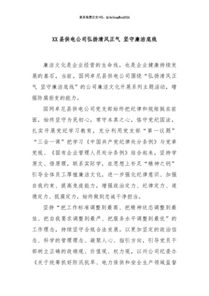 / 【七哥公文】2024年:XX县供电公司弘扬清风正气 坚守廉洁底线+更多免费公文+VX:QiGeGongWen2024