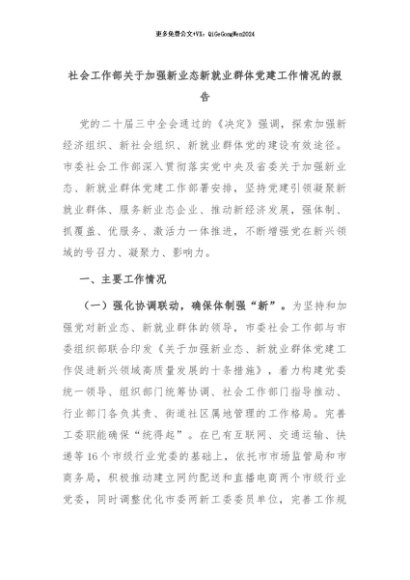 【七哥公文】2024年:社会工作部关于加强新业态新就业群体党建工作情况的报告+更多免费公文+VX:QiGeGongWen2024