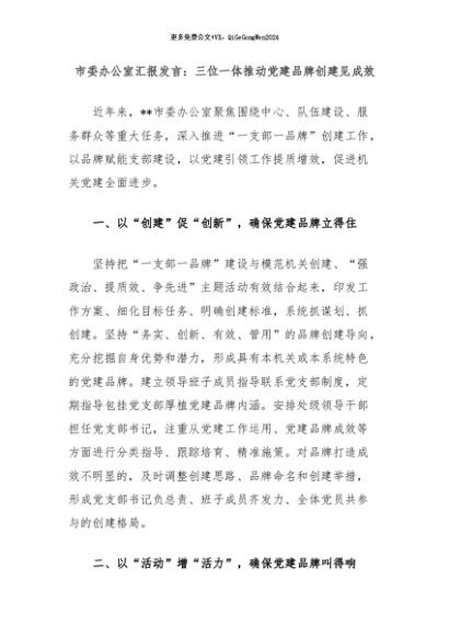 【七哥公文】2024年:市委办公室汇报发言:三位一体推动党建品牌创建见成效+更多免费公文+VX:QiGeGongWen2024