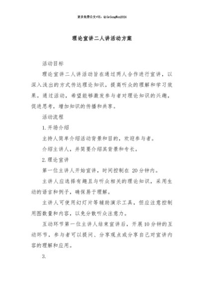/ 【七哥公文】2024年:理论宣讲二人讲活动方案+更多免费公文+VX:QiGeGongWen2024
