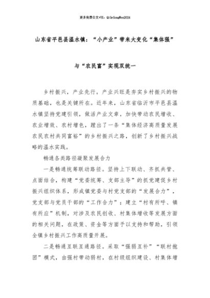 【七哥公文】2024年:山东省平邑县温水镇:“小产业”带来大变化“集体强”与“农民富”实现双统一+更多免费公文+VX:QiGeGongWen2024