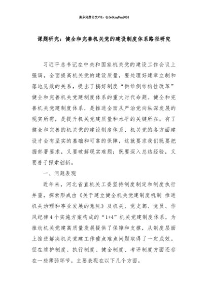 / 【七哥公文】2024年:课题研究:健全和完善机关党的建设制度体系路径研究+更多免费公文+VX:QiGeGongWen2024