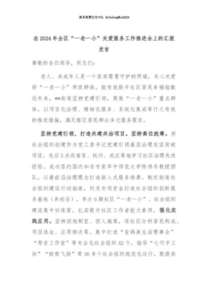 【七哥公文】2024年:在2024年全区“一老一小”关爱服务工作推进会上的汇报发言+更多免费公文+VX:QiGeGongWen2024