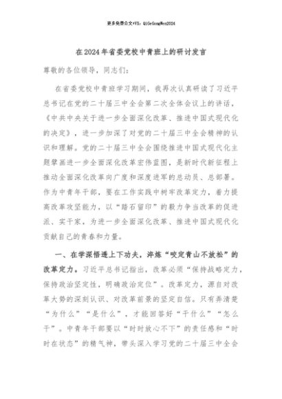 / 【七哥公文】2024年:在2024年省委党校中青班上的研讨发言+更多免费公文+VX:QiGeGongWen2024