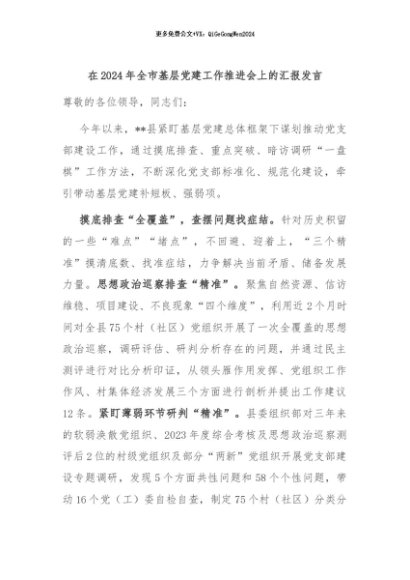 / 【七哥公文】2024年:在2024年全市基层党建工作推进会上的汇报发言+更多免费公文+VX:QiGeGongWen2024