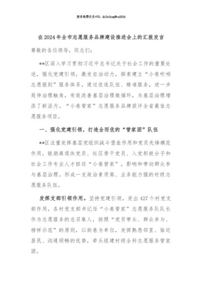 【七哥公文】2024年:在2024年全市志愿服务品牌建设推进会上的汇报发言+更多免费公文+VX:QiGeGongWen2024