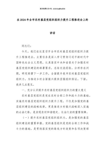 【七哥公文】2024年:在2024年全市农村基层党组织组织力提升工程推进会上的讲话+更多免费公文+VX:QiGeGongWen2024