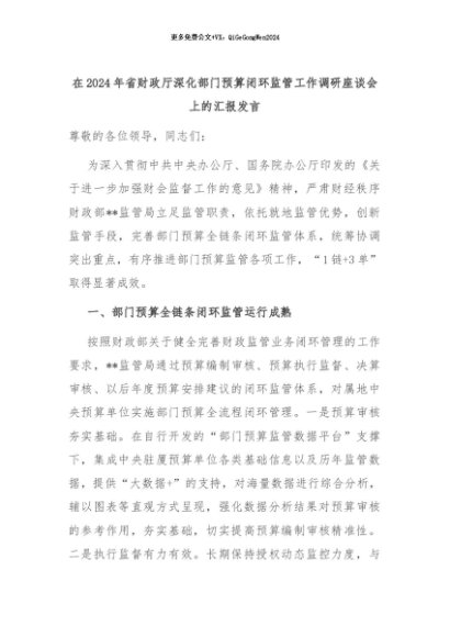 【七哥公文】2024年:在2024年省财政厅深化部门预算闭环监管工作调研座谈会上的汇报发言 (1)+更多免费公文+VX:QiGeGongWen2024