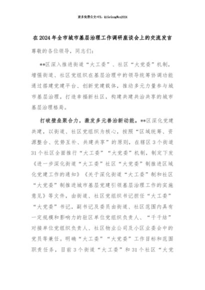 【七哥公文】2024年:在2024年全市城市基层治理工作调研座谈会上的交流发言+更多免费公文+VX:QiGeGongWen2024