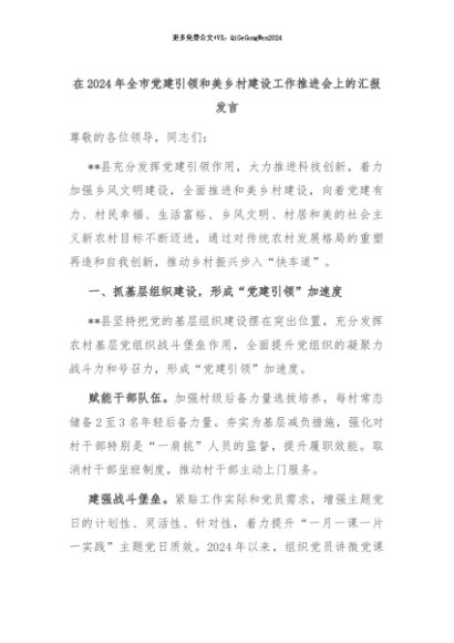 【七哥公文】2024年:在2024年全市党建引领和美乡村建设工作推进会上的汇报发言+更多免费公文+VX:QiGeGongWen2024
