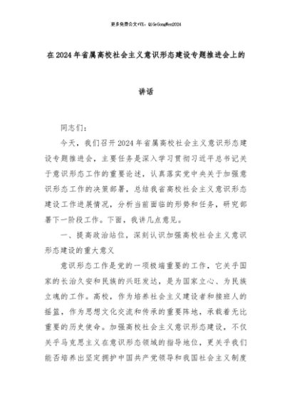 【七哥公文】2024年:在2024年省属高校社会主义意识形态建设专题推进会上的讲话+更多免费公文+VX:QiGeGongWen2024