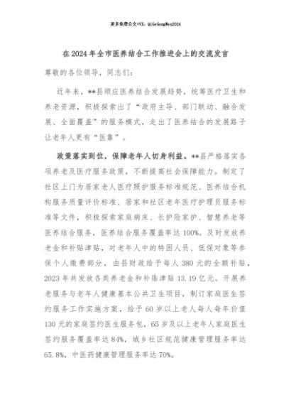 / 【七哥公文】2024年:在2024年全市医养结合工作推进会上的交流发言+更多免费公文+VX:QiGeGongWen2024