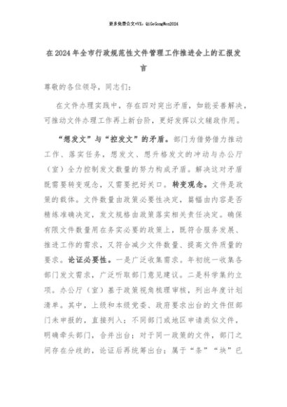 【七哥公文】2024年:在2024年全市行政规范性文件管理工作推进会上的汇报发言+更多免费公文+VX:QiGeGongWen2024
