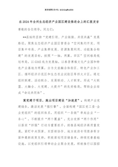 【七哥公文】2024年:在2024年全州生态经济产业园区建设推进会上的汇报发言+更多免费公文+VX:QiGeGongWen2024