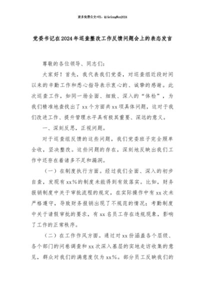 【七哥公文】2024年:党委书记在2024年巡查整改工作反馈问题会上的表态发言+更多免费公文+VX:QiGeGongWen2024