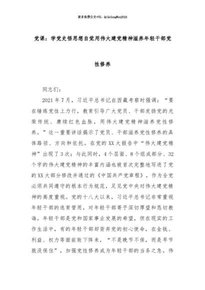 【七哥公文】2024年:党课:学党史悟思想自觉用伟大建党精神滋养年轻干部党性修养+更多免费公文+VX:QiGeGongWen2024
