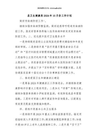 / 【七哥公文】2024年:县卫生健康局2024年10月份工作计划+更多免费公文+VX:QiGeGongWen2024