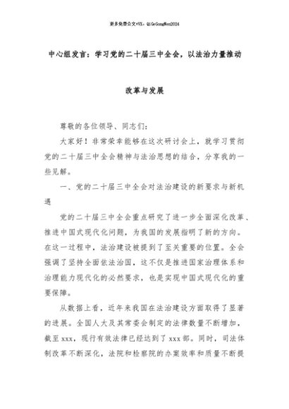 【七哥公文】2024年:中心组发言:学习党的二十届三中全会,以法治力量推动改革与发展+更多免费公文+VX:QiGeGongWen2024