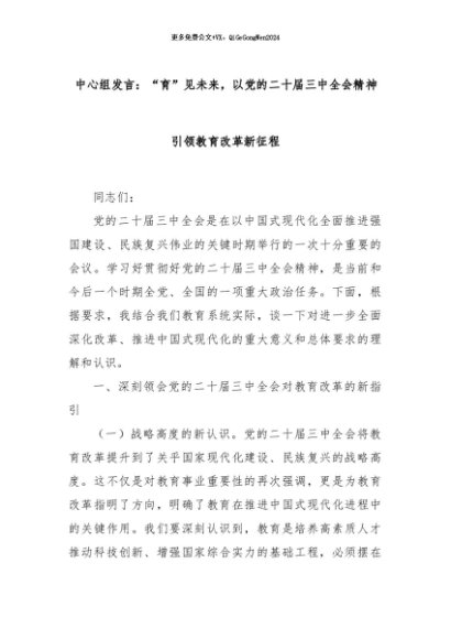 【七哥公文】2024年:中心组发言:“育”见未来,以党的二十届三中全会精神引领教育改革新征程+更多免费公文+VX:QiGeGongWen2024