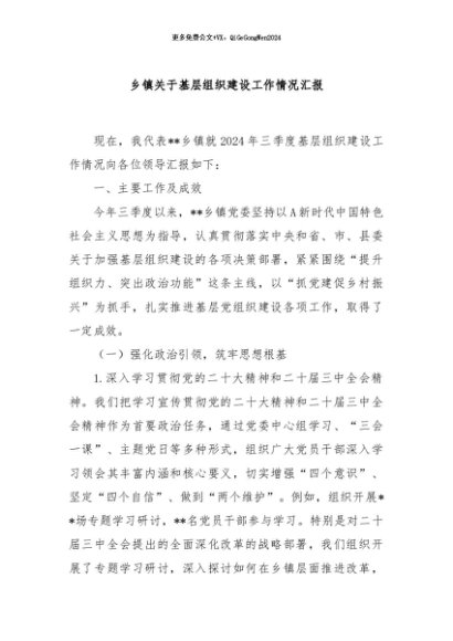 / 【七哥公文】2024年:乡镇关于基层组织建设工作情况汇报+更多免费公文+VX:QiGeGongWen2024