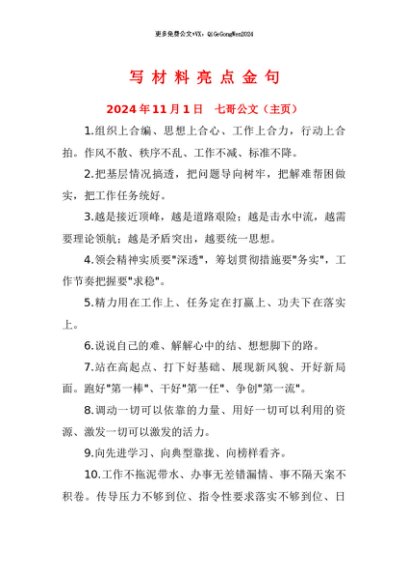 【七哥公文】2024年:(66例)写材料亮点金句+更多免费公文+VX:QiGeGongWen2024