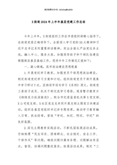 / 【七哥公文】2024年:X街道2024年上半年基层党建工作总结+更多免费公文+VX:QiGeGongWen2024