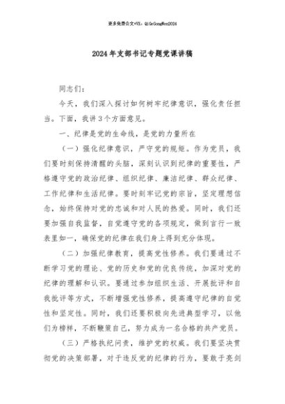 / 【七哥公文】2024年:2024年支部书记专题党课讲稿+更多免费公文+VX:QiGeGongWen2024