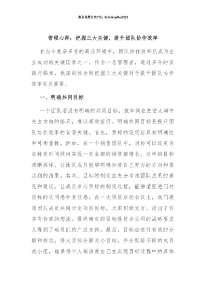 / 【七哥公文】2024年:管理心得:把握三大关键,提升团队协作效率+更多免费公文+VX:QiGeGongWen2024