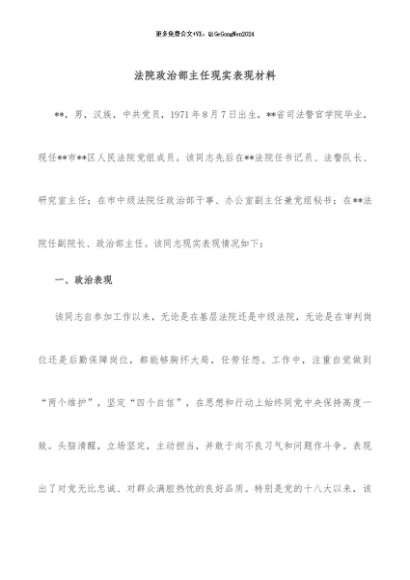 / 【七哥公文】2024年:法院政治部主任现实表现材料+更多免费公文+VX:QiGeGongWen2024