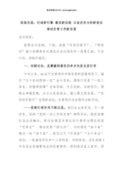 【七哥公文】2024年:经验交流:打造新引擎 激活新动能 以奋发有为的新姿态推动交管工作新发展+更多免费公文+VX:QiGeGongWen2024