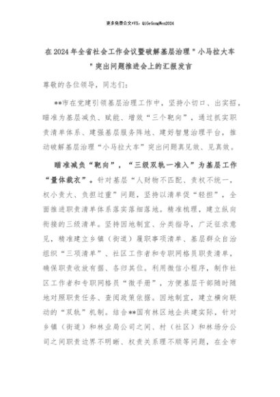 【七哥公文】2024年:在2024年全省社会工作会议暨破解基层治理"小马拉大车"突出问题推进会上的汇报发言+更多免费公文+VX:QiGeGongWen2024
