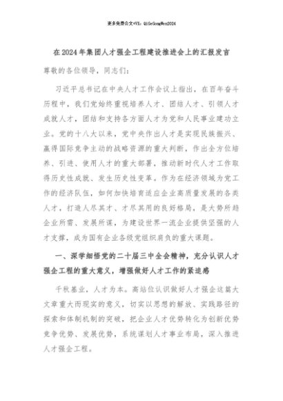 【七哥公文】2024年:在2024年集团人才强企工程建设推进会上的汇报发言+更多免费公文+VX:QiGeGongWen2024