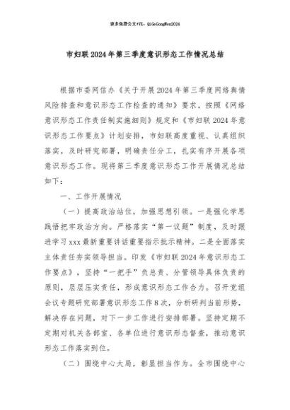 / 【七哥公文】2024年:市妇联2024年第三季度意识形态工作情况总结+更多免费公文+VX:QiGeGongWen2024