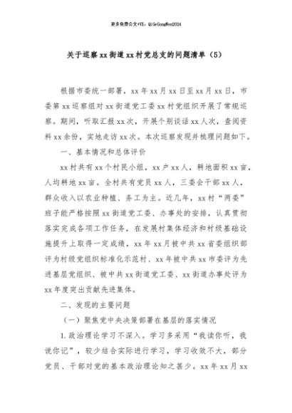 / 【七哥公文】2024年:关于巡察xx街道xx村党总支的问题清单(5)+更多免费公文+VX:QiGeGongWen2024