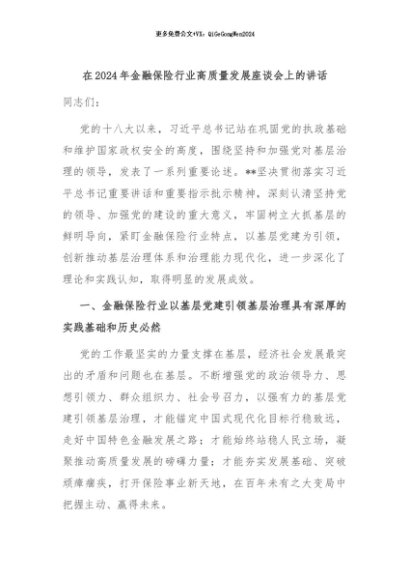 / 【七哥公文】2024年:在2024年金融保险行业高质量发展座谈会上的讲话+更多免费公文+VX:QiGeGongWen2024