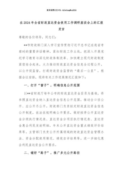 【七哥公文】2024年:在2024年全省财政直达资金使用工作调研座谈会上的汇报发言+更多免费公文+VX:QiGeGongWen2024