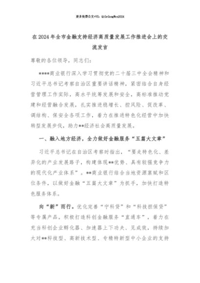 【七哥公文】2024年:在2024年全市金融支持经济高质量发展工作推进会上的交流发言+更多免费公文+VX:QiGeGongWen2024