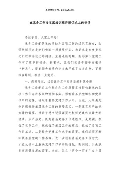 【七哥公文】2024年:在党务工作者示范培训班开班仪式上的讲话+更多免费公文+VX:QiGeGongWen2024