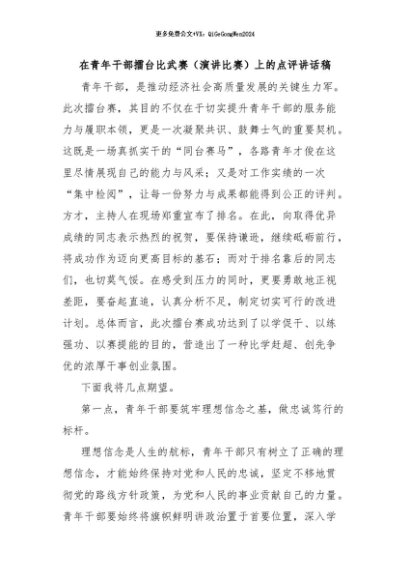 / 【七哥公文】2024年:在青年干部擂台比武赛(演讲比赛)上的点评讲话稿+更多免费公文+VX:QiGeGongWen2024
