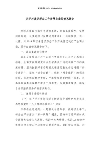 / 【七哥公文】2024年:关于对意识形态工作开展自查的情况报告+更多免费公文+VX:QiGeGongWen2024