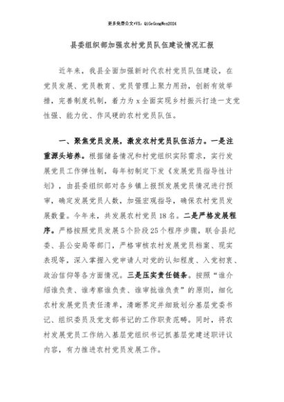 / 【七哥公文】2024年:县委组织部加强农村党员队伍建设情况汇报+更多免费公文+VX:QiGeGongWen2024