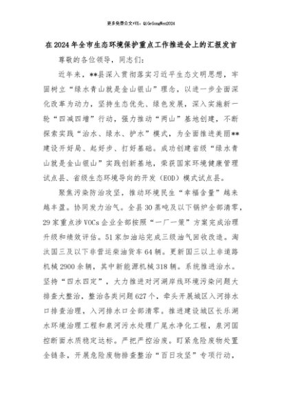 【七哥公文】2024年:在2024年全市生态环境保护重点工作推进会上的汇报发言+更多免费公文+VX:QiGeGongWen2024