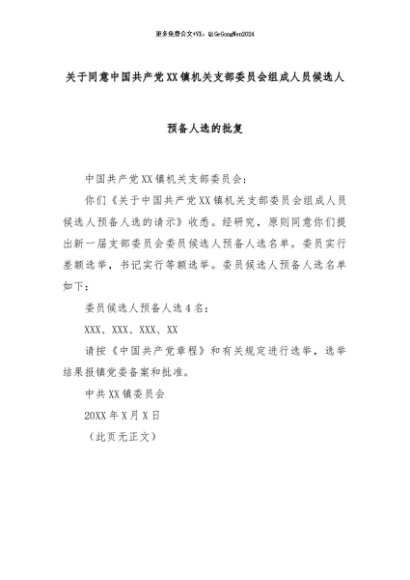 【七哥公文】2024年:关于同意中国共产党XX镇机关支部委员会组成人员候选人预备人选的批复+更多免费公文+VX:QiGeGongWen2024