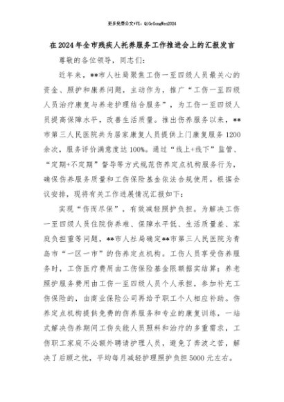 【七哥公文】2024年:在2024年全市残疾人托养服务工作推进会上的汇报发言+更多免费公文+VX:QiGeGongWen2024
