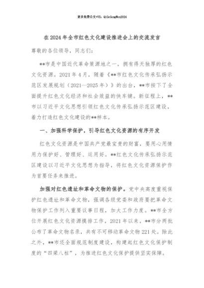 / 【七哥公文】2024年:在2024年全市红色文化建设推进会上的交流发言+更多免费公文+VX:QiGeGongWen2024