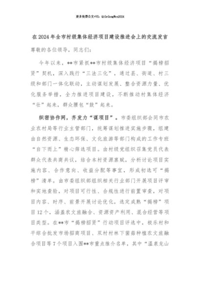 【七哥公文】2024年:在2024年全市村级集体经济项目建设推进会上的交流发言+更多免费公文+VX:QiGeGongWen2024