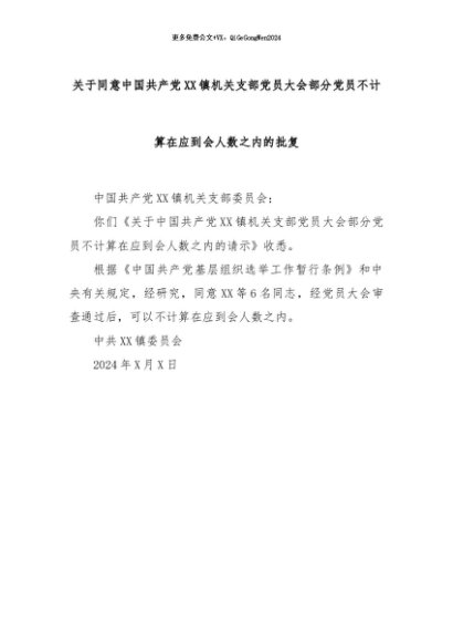 【七哥公文】2024年:关于同意中国共产党XX镇机关支部党员大会部分党员不计算在应到会人数之内的批复+更多免费公文+VX:QiGeGongWen2024