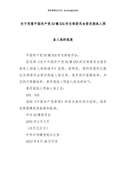 【七哥公文】2024年:关于同意中国共产党XX镇XXX村支部委员会委员候选人预备人选的批复+更多免费公文+VX:QiGeGongWen2024