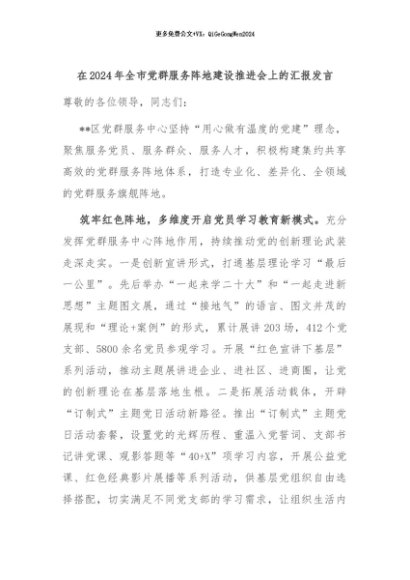 【七哥公文】2024年:在2024年全市党群服务阵地建设推进会上的汇报发言+更多免费公文+VX:QiGeGongWen2024